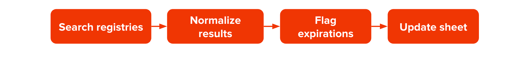 Legal and compliance teams constantly verify that licenses and public records stay current. Automations now handle this by filling out state lookup forms, pulling results, and flagging expirations. Whether it’s a medical license, real-estate registration, or a state filing, the automation quietly compiles the data into a live spreadsheet and sends a heads-up before anything lapses.