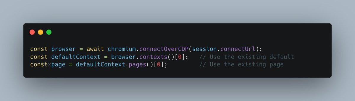 A browser context is like an isolated, temporary browser profile with its own cookies, storage, and fingerprint. If you create a new page, you wipe that fingerprint. Browserbase creates a default browser context for you. Using this context is important because Browserbase preconfigures your fingerprint and stealth profile automatically, no setup required.
