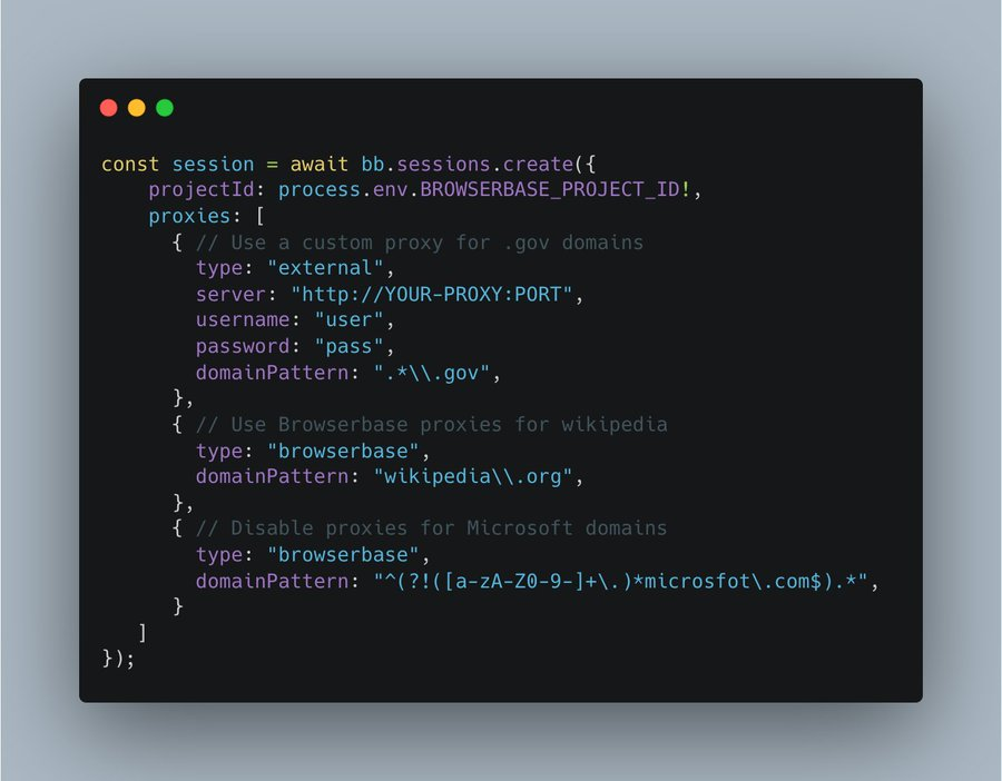 A proxy server is an intermediary that handles your internet requests, acting as a gateway between your device and the internet. It receives your requests, forwards them to the destination server on your behalf, and then returns the data to you. Sometimes you need different proxies for different sites. Browserbase lets you define custom proxy routing rules, and you can even disable proxies for certain sites using our regex-based domain pattern argument.