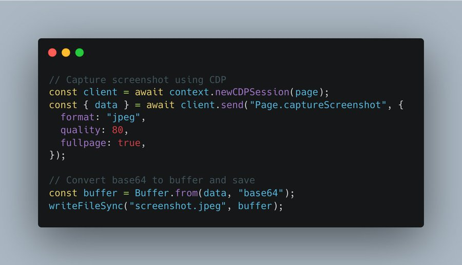 CDP is so great it also works for screenshots. If you want faster, higher-fidelity screenshots you can use CDP directly.