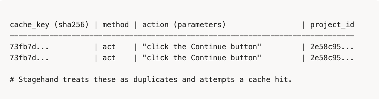 Concretely, the request is normalized (URL + action config + variables), hashed, and used to query for candidate entries scoped to the Project ID. For each candidate, Stagehand passively compares the current page snapshot fingerprint against what the entry was recorded against. If that comparison clears a safety threshold, Stagehand reuses the stored selector and executes the action directly via the SDK.
