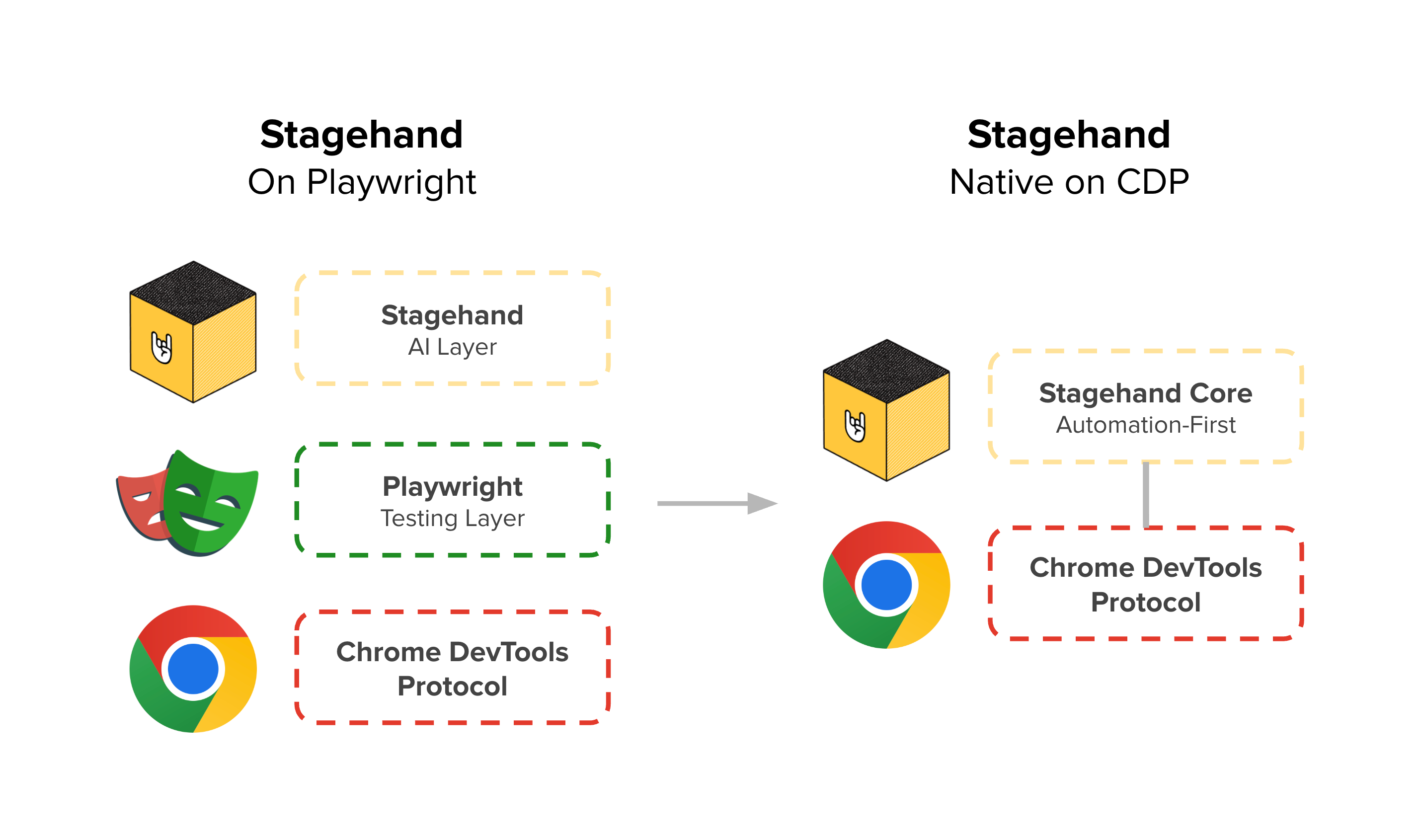 Stagehand began as an AI-centric layer built on Playwright, adding new capabilities like act, extract, and observe on top of its existing API. That choice lets developers plug Stagehand into existing scripts in minutes and ship real automations fast. As the community has grown and our ambitions are expanding, we have run into the natural limits of building on a test‑first framework. This post is a look back at why Playwright was the right starting point, and why we’re taking Stagehand deeper into the browser stack.