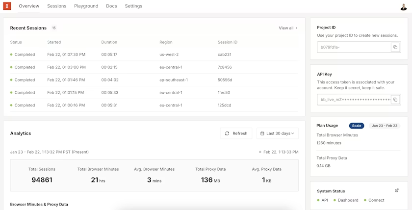 It’s browser infrastructure as a service. I get clean, ephemeral, single-use environments that spin up fast, behave consistently, and disappear when I’m done. There are no machines to provision, no containers to update, no Chromium binaries to pin or patch, and no browser-state to clean up. Instead of launching a local browser, you’re dialing into a preconfigured Chromium instance whose entire job is to execute your automation once and then vanish.